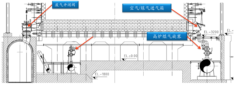 廢氣開閉器及煙道布置在焦爐焦側,混合煤氣及空氣導入裝置布置在焦爐機側,便于調節從機側到焦側各立火道煤氣流和空氣流,且便于廢氣流的排出,有利于焦爐長向加熱的均勻性。